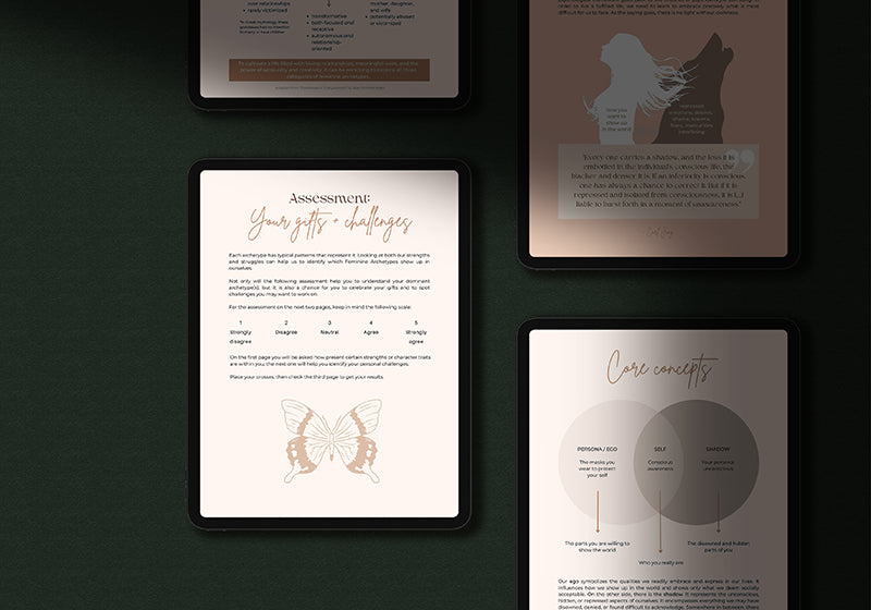 Each page was designed with love for you to enjoy. The contents are a mixture of journaling prompts, informative sections (archetype traits; psychological and spiritual concepts) and little exercises/rituals.